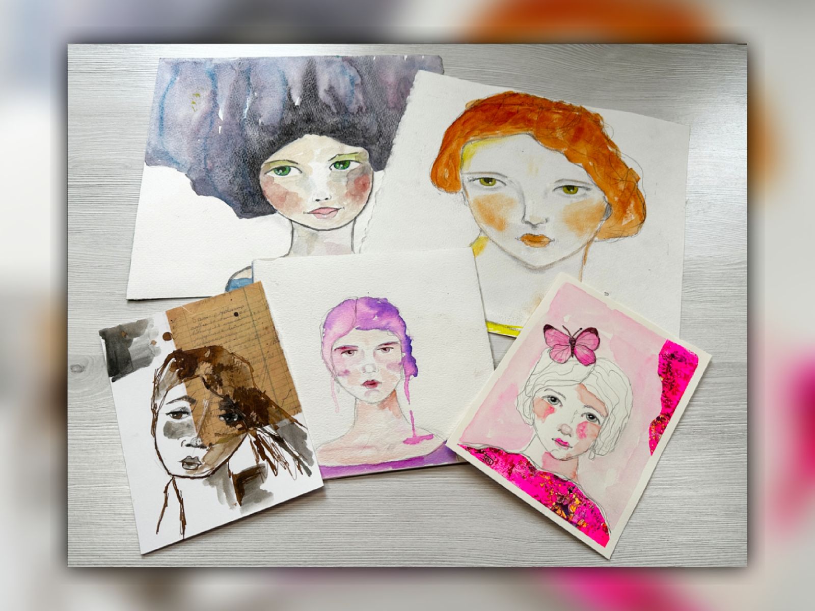 Sobald die Zeichnung fertig ist, erwecken wir die Gesichter mit Aquarellfarben zum Leben. Wir beschäftigen uns mit weichen Schichten, subtilen Schatten und verspielten Farbkombinationen. Collagenelemente können für zusätzliche Textur und Persönlichkeit hinzugefügt werden, aber der Schwerpunkt liegt weiterhin auf dem Zeichnen und Malen.