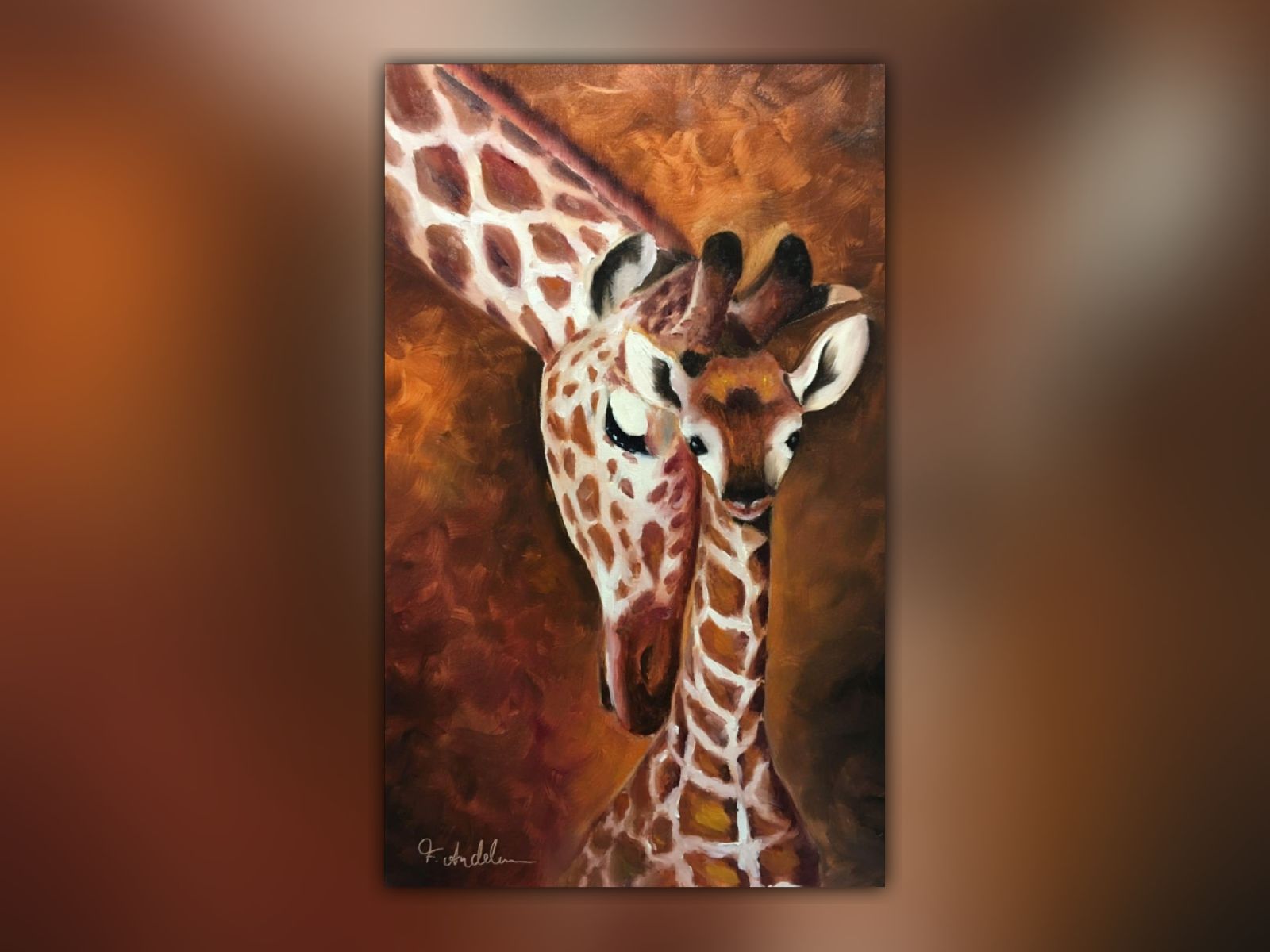 In diesem Kurs malst du ein liebevolles Motiv: eine Giraffenmutter, die sich schützend an ihr Junges schmiegt. Die warmen Braun- und Goldtöne, das weiche Licht und die feinen Muster des Fells verleihen dem Bild eine besondere, innige Stimmung.